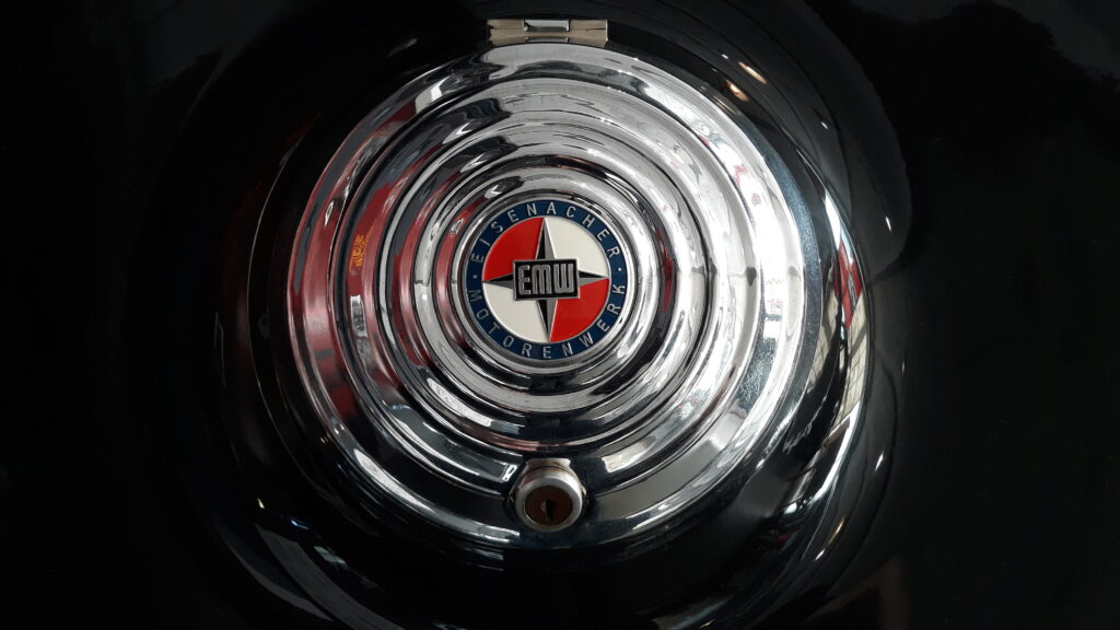 Ongeveer in dezelfde tijd besluit BMW AG in München het eigen merkrecht te verdedigen en kondigt aan om een proces te voeren voor het alleenrecht op het merk BMW. De fabriek in Eisenach is namelijk vrolijk doorgegaan met het gebruiken van het BMW merk en logo op hun auto- en motorfiets producten. In 1952 krijgt BMW gelijk van de rechter en deze velt het vonnis dat “Eisenach” een nieuw merk en beeldmerk moet gaan voeren. Het is op onderstaande foto’s duidelijk te zien EMW, Eisenacher Motorenwerk. Niet zonder een knipoog, zou ik zeggen…